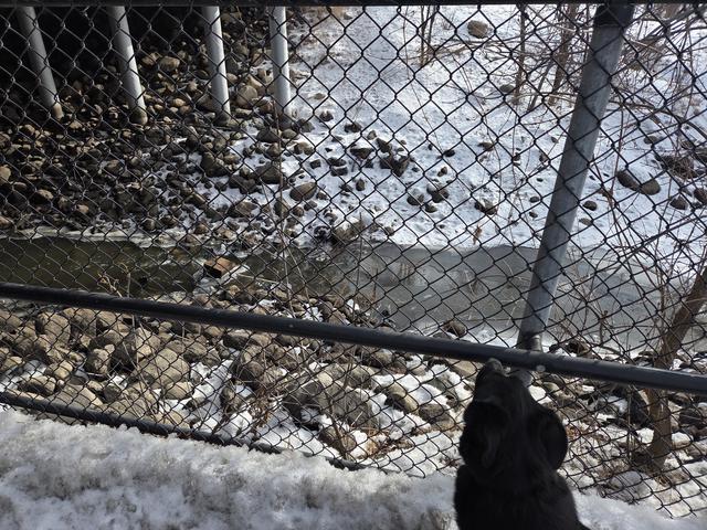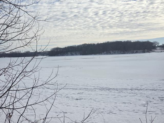 View from SW shoreline by Elm Creek Entry/I-94 overpass. Flow from Elm Creek is beginning to weaken ice in that area.